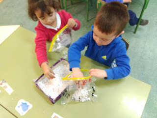 Hoy hemos hecho una bolsa del invierno para practicar la técnica del soplo, que divertido.